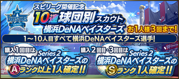 ◆10連球団別スカウト 横浜DeNAベイスターズ横浜DeNAベイスターズの選手だけが獲得できるお1人様3回限りの10連スカウトです。